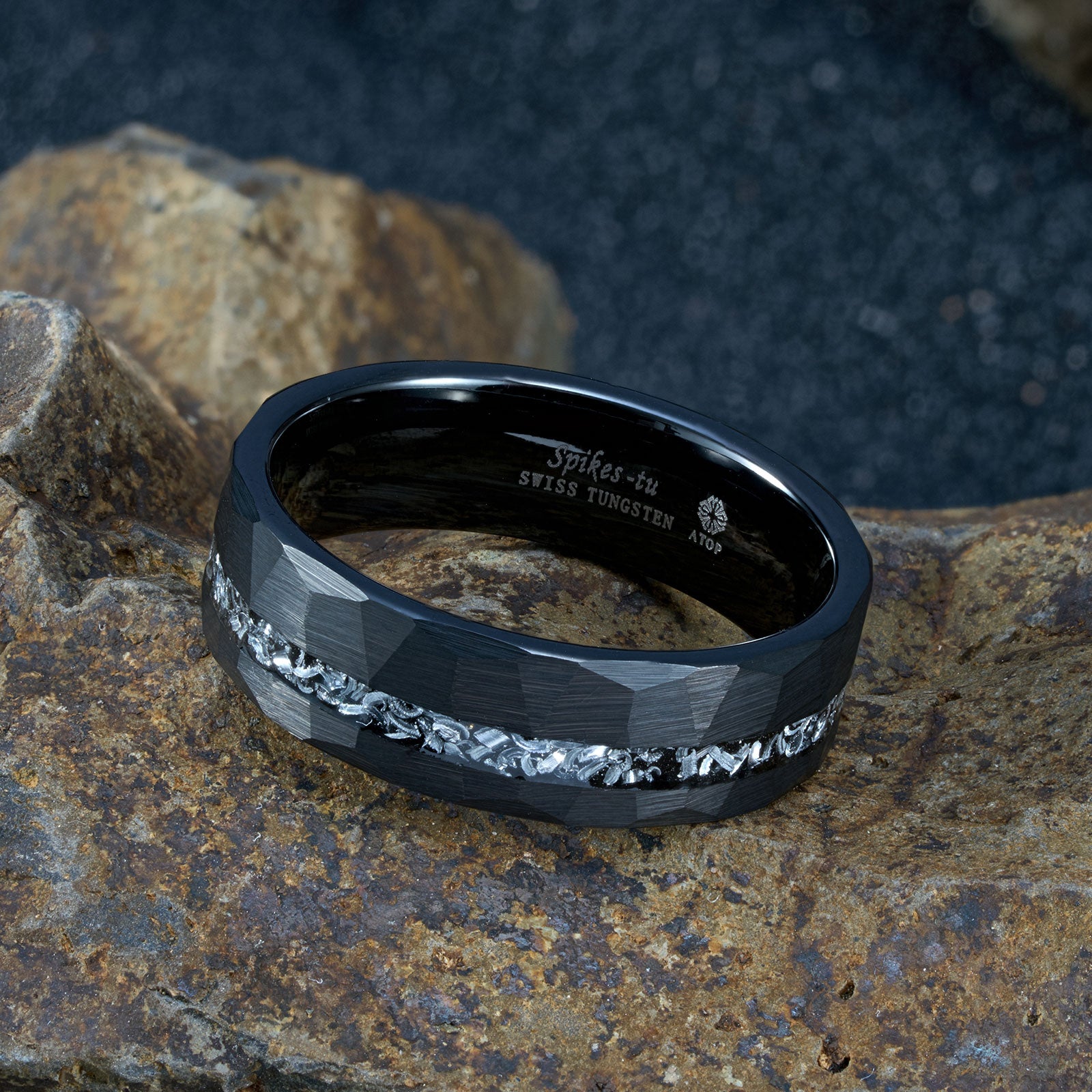 • Load image into Gallery viewer, 8mm Black Meteorite Tungsten Ring Sliver Line Mens Wedding Band ATOP Jewelry